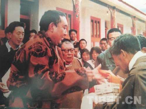 圖為十世班禪向四川若爾蓋中學(xué)捐款。圖片翻拍自《班禪大師在四川》