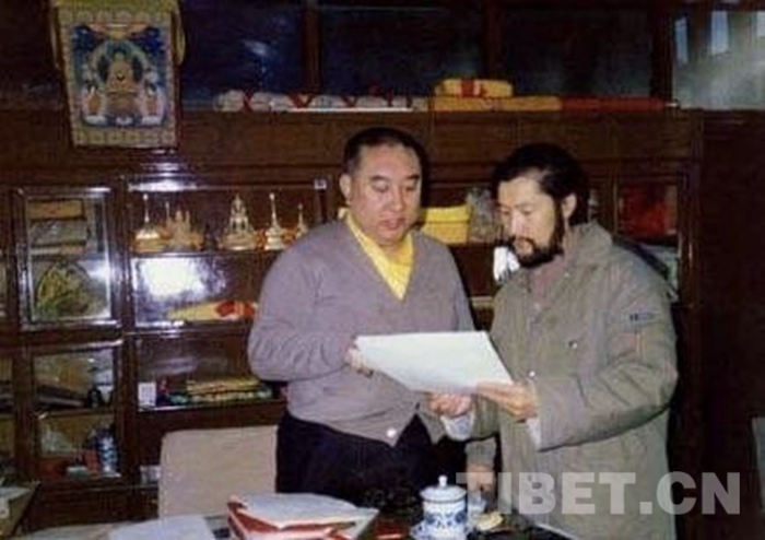 圖為1987年初,十世班禪大師和畫家洛松向秋探討援助西藏發(fā)展基金會徽標事宜。