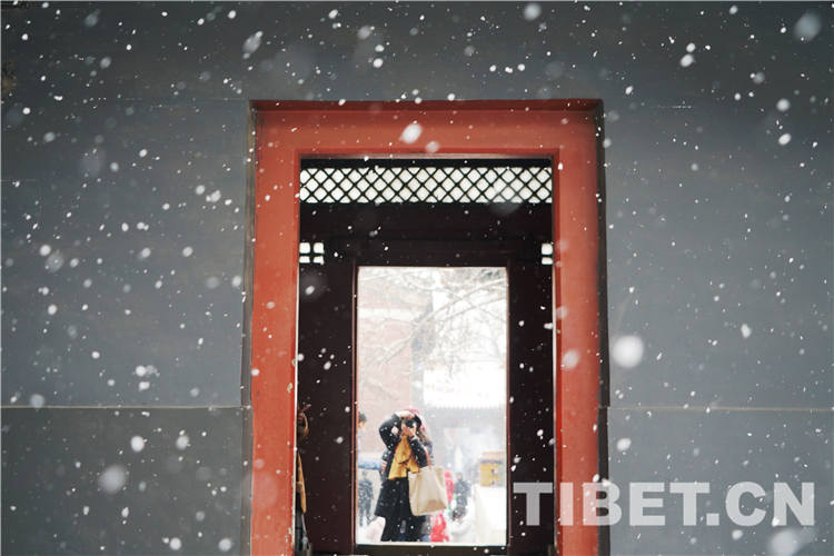 盡管春寒料峭,阻擋不了人們賞雪的心情,有游客身著漢服,給這冰天雪地里的深瓦紅墻裝點(diǎn)上一抹亮色。