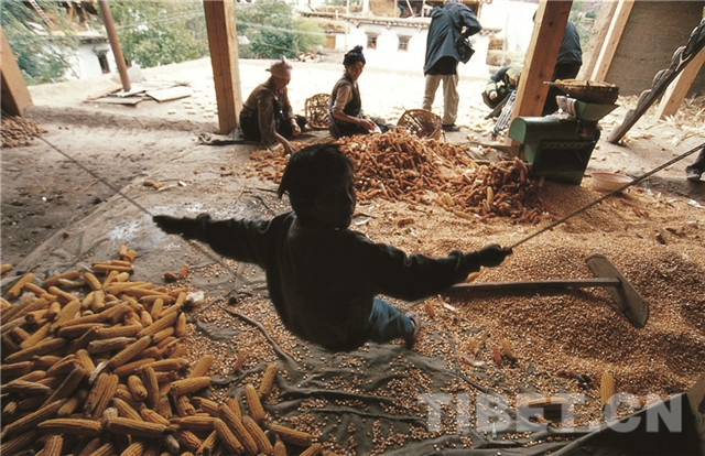 十月的鹽井正是收獲的季節(jié),金燦燦的玉米和圓潤飽滿的核桃鋪滿了每家每戶的房頂,樹上的水果吃不及,石榴、蘋果和梨掉了一地,路邊的小孩人手一支彈弓——用來打樹上的果子吃。動作慢的人家還在地里收割玉米、搶先一步的人家已經(jīng)在將曬干的玉米放進脫粒機了,而運核桃的汽車、馬幫則已經(jīng)上路。農(nóng)忙中的鹽井一派熱鬧歡騰景象。