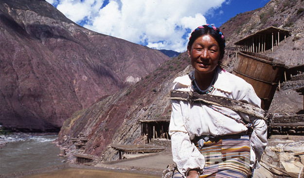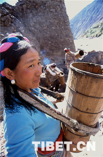鹽田里的事自古就是由女人操持的,按她們的解釋是因為男人粗心,會弄臟了白花花的鹽,賣不出好價去。所以男人就負(fù)責(zé)運輸和銷售工作,他們會在女人已經(jīng)曬出小山樣的一堆鹽巴時,趕著騾馬來把鹽馱走,然后跋山涉水到巴塘、德欽、昌都一帶,換錢糧或者茶葉。而女人就用自己的雙肩背起水桶,下到陡峭的江邊汲水,再沿著細(xì)小的棧道背到用木支架撐起的鹽田里,等無數(shù)桶鹵水將鹽田灌滿后,剩下的就是盼著陽光和風(fēng)快快將水分蒸干,第二天就可以收獲了。她們就這樣日復(fù)一日年復(fù)一年地將狹窄的山路踩踏了千萬遍。
