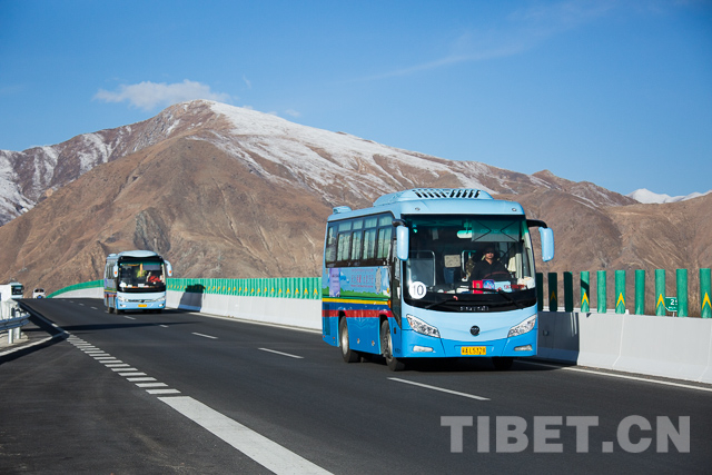 圖為旅游大巴行駛在拉薩至林芝高等級公路上。攝影:趙耀