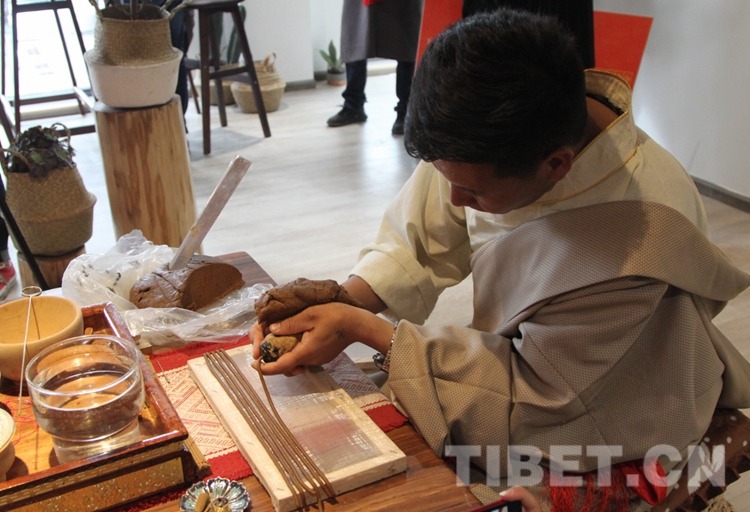 圖為活動(dòng)現(xiàn)場(chǎng),藏香匠人演示傳統(tǒng)藏香制作技藝。