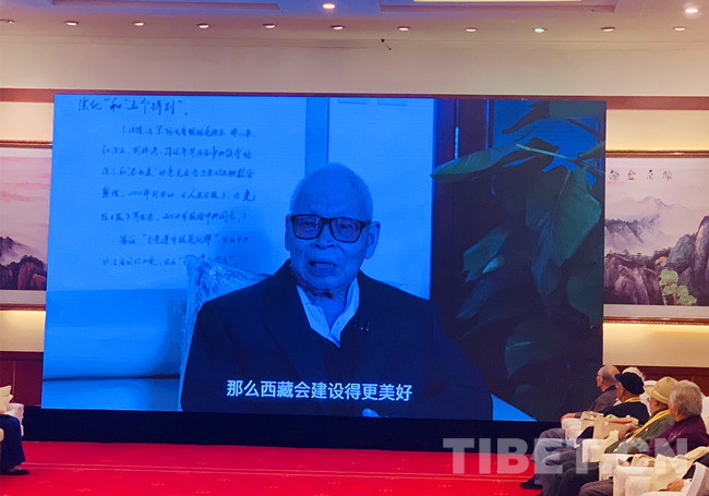 圖為原西藏自治區(qū)原黨委第一書(shū)記、十八軍52師副政委陰法唐同志視頻發(fā)言。
