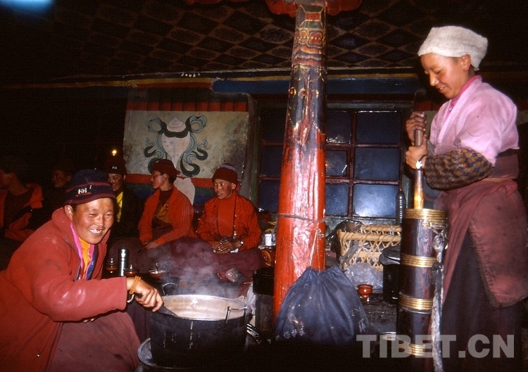 紅英是在昌都長(zhǎng)大的藏族人,她跟我說(shuō)起了一段她在內(nèi)地念大學(xué)時(shí)的往事?!拔胰サ絻?nèi)地喝不到家鄉(xiāng)的酥油茶,整天就想啊想,后來(lái)有一次幾位藏族同學(xué)聚會(huì),發(fā)現(xiàn)有人從家?guī)Я怂钟蛠?lái),大家如獲至寶,興奮的弄來(lái)一些茶葉,準(zhǔn)備喝一頓饞了好久的酥油茶??墒牵瑳]有茶桶?。∷钟鸵粩鄶嚢璨拍苋诘讲杷?,酥油和茶水融成的混合物再加上鹽才能叫“酥油茶”啊!