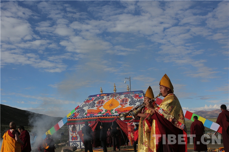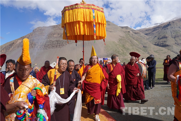 十一世班禪抵達(dá)岡仁波齊山腳下的色雄灘時(shí),色雄灘上回響起渾厚悠長的法號(hào)聲,高僧們手持香爐、高舉經(jīng)旗,打著幡幛、華蓋,吹奏佛樂,以藏傳佛教最莊重的宗教儀軌迎接十一世班禪的到來。