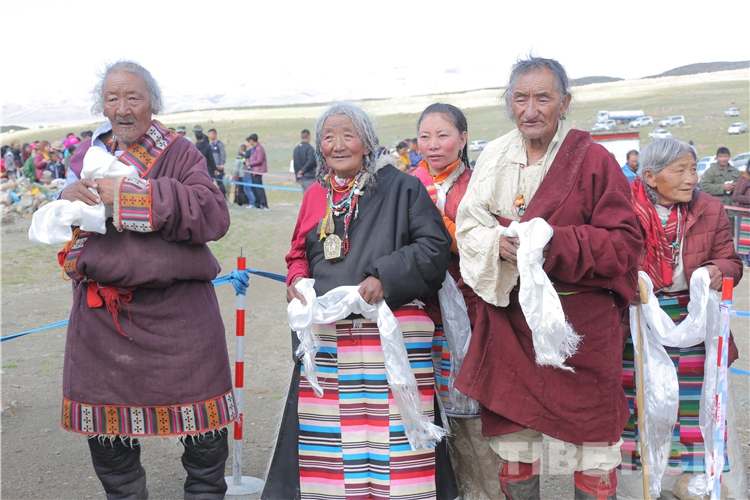 誦經(jīng)結(jié)束后,十一世班禪與在場的近百名僧俗信教群眾一同呼喊“吉吉索索拉佳羅”,并向空中拋撒糌粑,祈禱風(fēng)調(diào)雨順、五谷豐登、國泰民安,祈求神山護(hù)佑有情眾生。