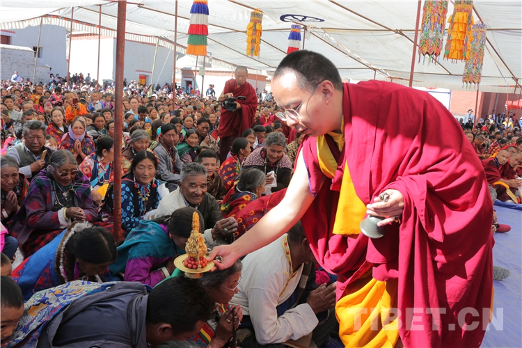 禮佛后,十一世班禪登上加查拉康正門前臨時(shí)寶座,接受托林寺僧人敬獻(xiàn)曼扎、切瑪?shù)?,隨后,在寺廟高僧引領(lǐng)下,為長(zhǎng)壽灌頂貢品加持,帶領(lǐng)眾僧共同誦經(jīng),祈愿莊嚴(yán)國(guó)土、國(guó)泰民安、普渡眾生,為1000余名僧俗信教群眾進(jìn)行長(zhǎng)壽灌頂。
