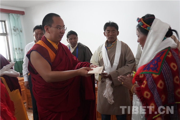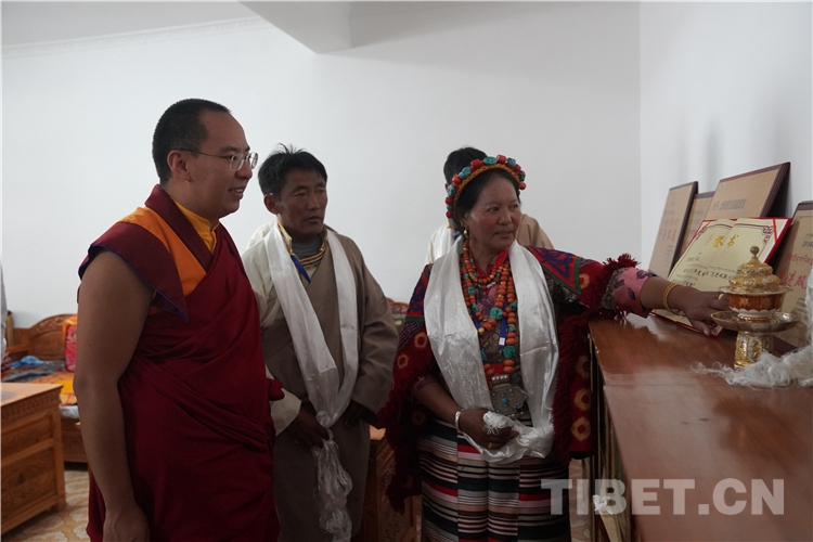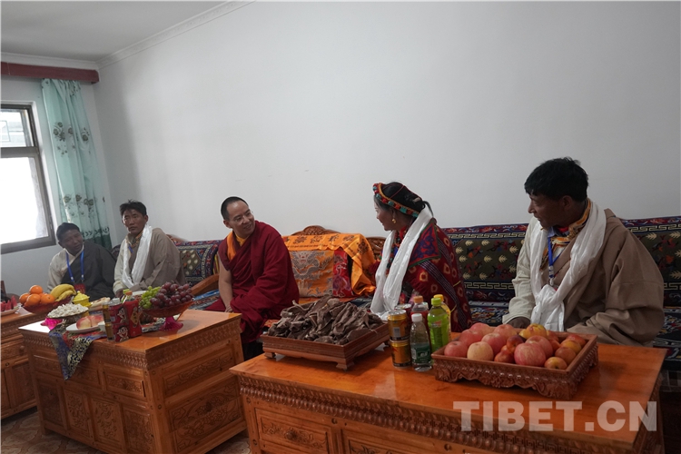 參觀朝拜活動(dòng)結(jié)束后,十一世班禪還前往古格王朝遺址腳下的札布讓村走訪看望農(nóng)戶金珠德吉并送去了慰問(wèn)金。金珠德吉一家在家門口迎接十一世班禪并敬獻(xiàn)哈達(dá),隨后迎請(qǐng)十一世班禪到客廳。十一世班禪與金珠德吉一家親切交談,詳細(xì)了解家庭生產(chǎn)生活情況。