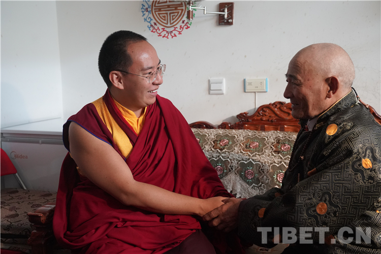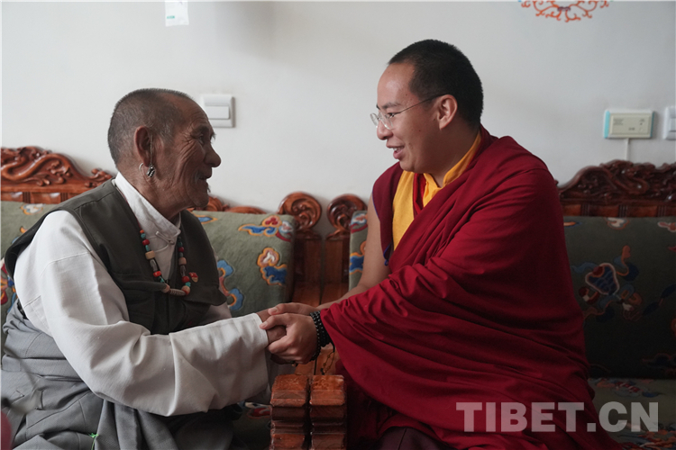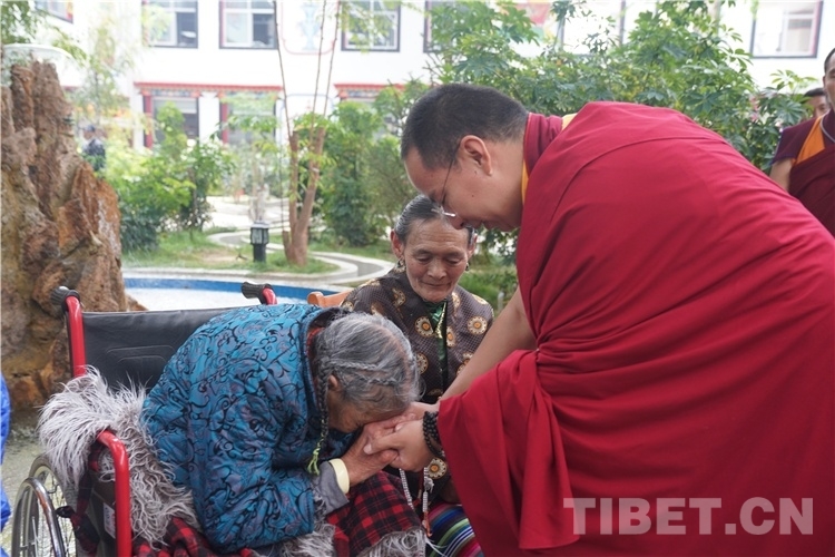 十一世班禪在參加各項(xiàng)活動(dòng)期間,專程看望阿里地區(qū)“雙集中”供(收)養(yǎng)服務(wù)中心的老人和孩子們,并為每一位老人摸頂賜福,噓寒問暖,給老人和孩子們帶去了親人般的關(guān)懷。一位老阿媽(嬤啦)當(dāng)場緊緊拉著十一世班禪的手放在自己的額頭,感動(dòng)流淚,嘴里不停地說“突吉其,突吉其”(謝謝!謝謝?。J皇腊喽U和老人們圍坐在一起飽含深情地說:“在黨中央的關(guān)心關(guān)懷下,老人家弱有所扶、老有所養(yǎng)、病有所醫(yī)、住有所居,這充分體現(xiàn)了社會(huì)主義制度的無比優(yōu)越性,看到你們健康幸福的生活我很欣慰,我會(huì)為你們祈禱,我會(huì)再來看望你們?!背錆M溫情的一幕使在場人員無不動(dòng)容。