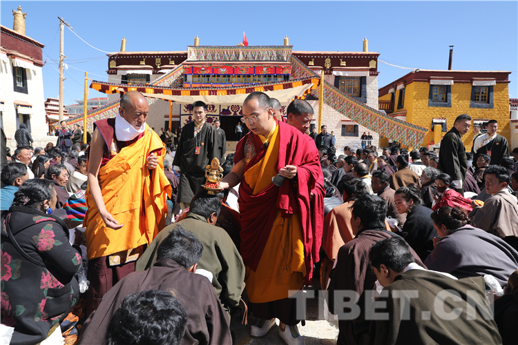 圖為珠康?土登克珠活佛向十一世班禪敬獻(xiàn)曼扎 攝影:鄭朔