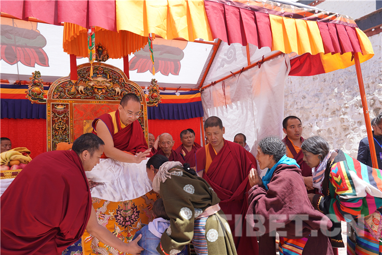 得知十一世班禪要來(lái),草原上的信教群眾把家中最華貴的衣服都穿在了身上。摸頂中,有信眾請(qǐng)十一世班禪吹一吹眼睛或撫摸傷痛處,十一世班禪總會(huì)盡心滿(mǎn)足。