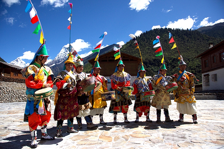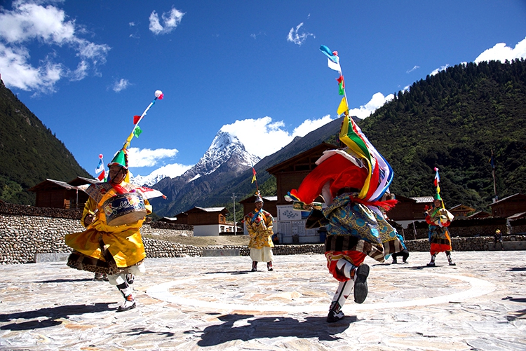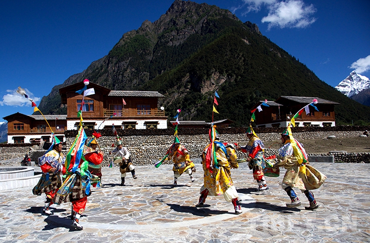中國西藏網(wǎng)訊 伴隨著一陣整齊的鼓點,西藏自治區(qū)林芝市工布江達縣錯高鄉(xiāng)錯高村的8位村民開始了梗舞表演。他們的身后是新建成的極具工布地方特色的二層民居,更遠處是巍峨聳立的杰青那拉嘎布雪山。
