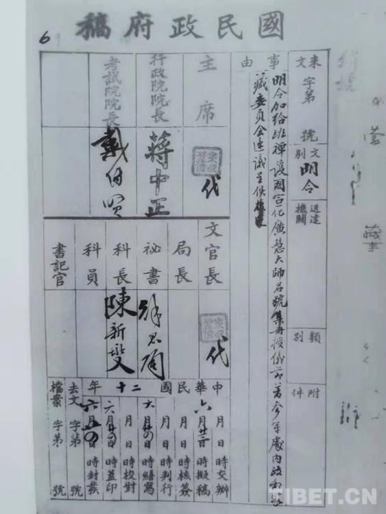 查班禪額爾德尼此次來(lái)京及覲見(jiàn),面陳藏事,并參加國(guó)民會(huì)議,其擁護(hù)中央熱誠(chéng),洵堪嘉尚。且班禪通達(dá)教理,行持精嚴(yán),康、藏各處喇嘛僧眾信仰至深。茲為對(duì)于各地喇嘛寺廟宣傳中央政令及撫慰信仰佛教民眾起見(jiàn),擬請(qǐng)?zhí)嘏砂喽U額爾德尼為西陲宣化使,并得在青海、西康兩省境內(nèi)選擇適宜地點(diǎn)組織行署,以便辦理一切宣化事宜。所有行署內(nèi)部組織、經(jīng)費(fèi)數(shù)目以及班禪年俸,均經(jīng)本會(huì)擬就詳細(xì)辦法,繕折呈奉蔣主席批示照準(zhǔn)在案……