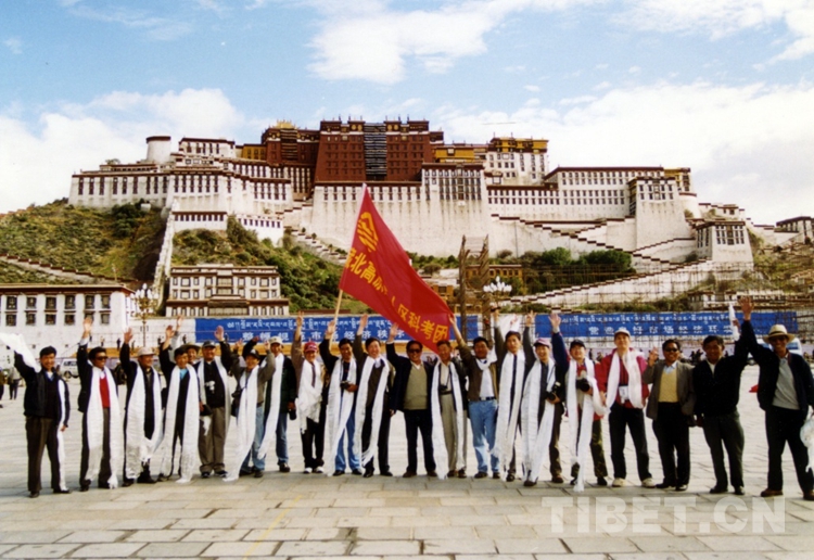 圖為藏北高原無(wú)人區(qū)科考團(tuán)人員在拉薩布達(dá)拉宮前揮旗出征無(wú)人區(qū),并合影留念(唐召明2001年6月26日攝)