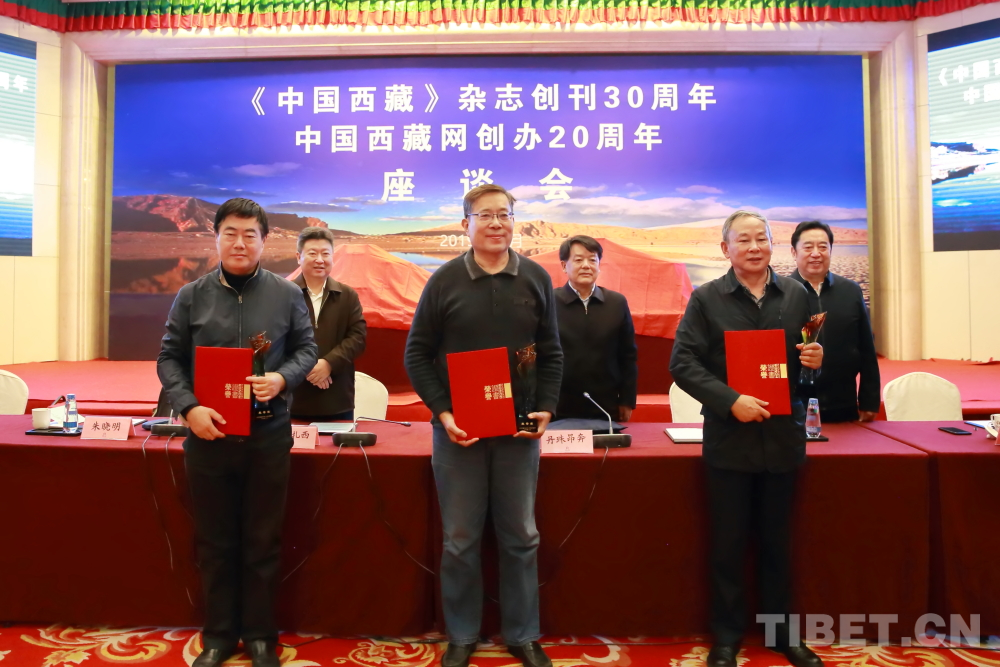 圖為全國人大民族委員會副主任委員丹珠昂奔(后排中),青海省委常委、統(tǒng)戰(zhàn)部部長公保扎西(后排左)、四川省政協(xié)原副主席羅布江村(后排右)為中國西藏雜志社退休老領(lǐng)導(dǎo)頒發(fā)榮譽(yù)證書