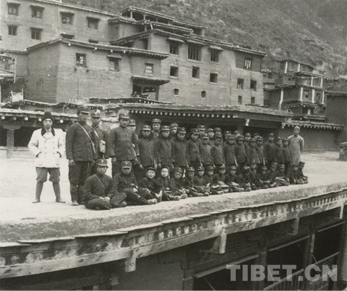 1918年,義敦縣府即毀于戰(zhàn)火,直到1939年才實(shí)質(zhì)性復(fù)治。該年7月,第24軍一部到達(dá)義敦,開(kāi)始重新修建縣府。期間因地方實(shí)力派對(duì)義敦復(fù)治采取抵制態(tài)度,屢生武力沖突,直到年底,縣府才基本修建完畢,義敦縣府正式辦公。當(dāng)時(shí),所謂與簡(jiǎn)陋的縣政府形成鮮明對(duì)比的德格縣(需要說(shuō)明的是,當(dāng)時(shí)的義敦縣并沒(méi)有學(xué)校)小學(xué)“豪華的學(xué)堂,其高大氣派的校舍”。照片的背景,其實(shí)是西康有名的德格土司官寨。