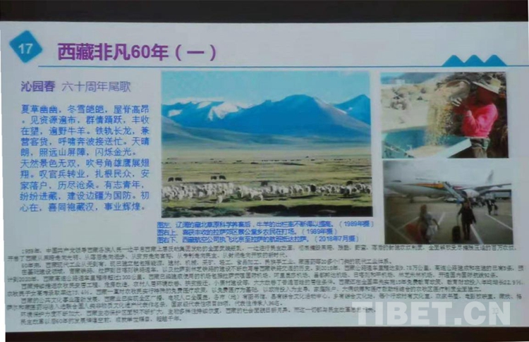 唐召明以照片敘事、詩詞抒情的形式,把西藏60多年來的發(fā)展變化和其間的感人瞬間展示出來,謳歌偉大的時代和詮釋這一偉大時代的“老西藏精神”。經(jīng)北京建藏援藏協(xié)會原副會長朱強配圖賦詩,有了“百首詩詞、百張圖文”的以詩配圖資料。一張張感人的照片和一首首充滿激情的詩歌,展示了在中國共產(chǎn)黨的領(lǐng)導(dǎo)下,新西藏在“短短幾十年,跨越上千年”的歷史巨變;道出了一切為了西藏人民的“老西藏精神”時代內(nèi)涵。全場聽眾凝神專注,不時響起熱烈的掌聲。