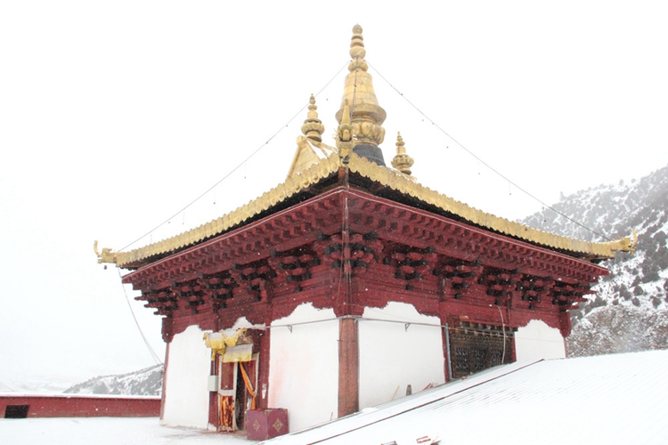 大殿三層為石頭壘的墻,墻體抹白色,稱為“白殿”。殿頂飾以飛檐金頂,呈飄逸升騰之勢(shì),殿頂正中豎有巨大的金頂寶珠,直指蒼穹。圖為查杰瑪大殿的“白殿” 攝影:李元梅