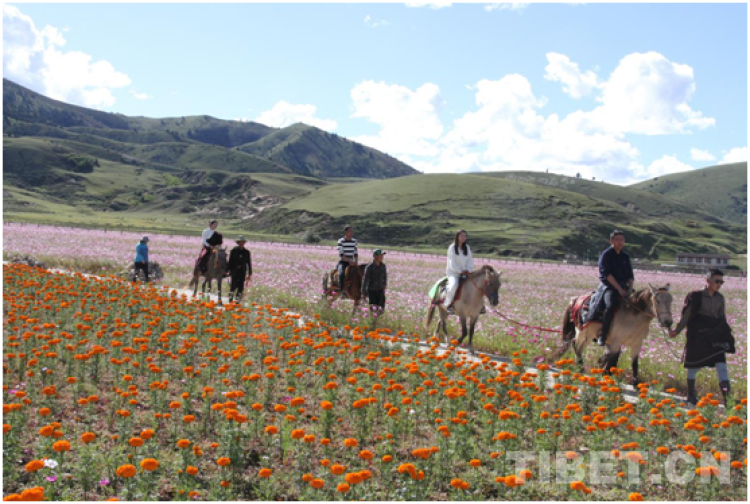 從理塘縣前往稻城亞丁機(jī)場(chǎng)方向60多公里,翻過一座小山坡,一片如夢(mèng)似幻的花海景觀瞬間映入眼簾。曾經(jīng)名不見經(jīng)傳的小山村——濯桑鄉(xiāng)漢戈村已實(shí)現(xiàn)“沙化地”到“花?!钡耐懽?,成為新的網(wǎng)紅打卡點(diǎn)。在花團(tuán)錦簇間拍照、在草原上騎馬,或者到旁邊康藏陽光種植基地采摘“極地果蔬”、購買農(nóng)民合作社的原生態(tài)農(nóng)副產(chǎn)品……游客可盡興體驗(yàn)。