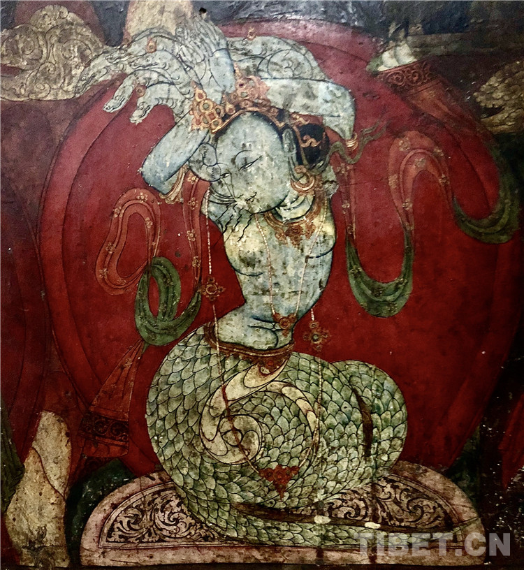 龍女,亦稱為“魯”或“魯女”,是一種上身為人、下身為龍的精靈。古格壁畫中這種人形龍造型的龍女,大都面容嬌美,扭動的身姿婀娜妖嬈,盤曲而坐,尾部上揚,有的頭頂還飾有數(shù)條小龍。相傳龍女棲息于水中、灶頭、古樹間,為所有動物的首領(lǐng)。上圖中,龍女青藍(lán)色的身體映襯在紅色的背景中,冷暖相宜,異常美艷動人。其他幾幅都以白色或肉色為主調(diào),在繁復(fù)的深色環(huán)境圖中顯得很打眼,如下面這兩幅。
