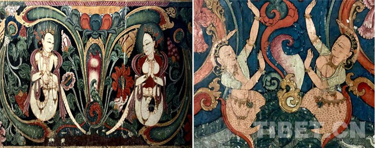托林寺以龍女為代表的女性形象,留給我極深的印象,她們一方面?zhèn)鬟_(dá)的是宗教的光明和神圣,表現(xiàn)形式卻又是世俗的抒情性和誘惑性并存。端莊的面龐,優(yōu)雅的微笑,半裸的豐滿身軀扭轉(zhuǎn)出性感的曲線,置身于繪滿的花草圖案中,極盡優(yōu)美。當(dāng)我走進(jìn)這些畫作中,看著看著就迷失了,常常不知她們是人還是神,那空間是人間還是天國。(中國西藏網(wǎng) 文、圖/陳丹)