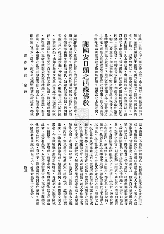 1887年,謝國安出生在今四川省甘孜縣絨壩岔。他的藏名為多吉卓巴,后因信仰基督教,取名Paul Sherap(人稱智慧保羅,我們注意到此名帶有藏文音譯),漢名謝國安。10歲時(shí),他離開家鄉(xiāng)進(jìn)入拉薩哲蚌寺學(xué)經(jīng)。不久,謝國安離開寺廟,跟隨藏商商隊(duì)去了錫金甘托克、印度大吉嶺的教會(huì)學(xué)校學(xué)習(xí)藏文、英文和梵文。后應(yīng)孟加拉亞洲學(xué)會(huì)之請,到加爾各答參與校訂《藏文大藏經(jīng)·甘珠爾》。他兼通藏、英、梵三種文字,熟練地用藏、英語會(huì)話。辛亥革命爆發(fā)后,他返回內(nèi)地,之后定居康定。此后一段時(shí)間在康定的國立師范學(xué)校任教,主持編寫了多部教材,如《西康國語教科書》(8冊)、《西康常識(shí)教科書》(8冊)、《西康公民教科書》等。這套教科書編輯方法,系根據(jù)教育部頒“小學(xué)課程標(biāo)準(zhǔn)”及西康特殊環(huán)境,先編漢文,再用藏文譯注,對(duì)民國時(shí)期西康教育發(fā)展和推廣起到特殊的推動(dòng)作用。他曾在西康舉辦的“縣訓(xùn)班”擔(dān)任藏文教員。當(dāng)時(shí)著名學(xué)者李思純曾在康定見過他,印象較好,認(rèn)為他“居印度甚久,故能操英語等,現(xiàn)居康定,研習(xí)藏文甚深?!?938年,著名學(xué)者柯象峰到康定一帶考察時(shí),受到謝的熱情接待和幫助。他在日記里對(duì)謝國安頗有贊詞,10月9日的日記中提到“午時(shí)左右,謝國安君來訪,托其購佛經(jīng)數(shù)部?!睅滋旌笾x國安即將“購得之佛經(jīng)十余部一一為之譯名及指出出版處”。