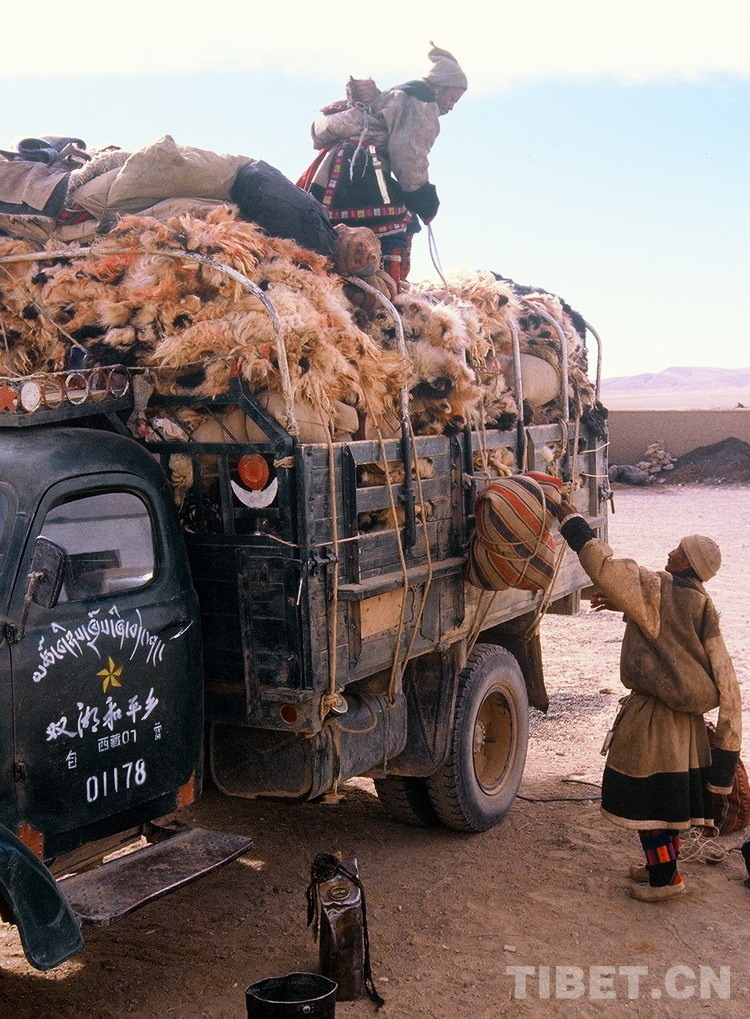 這是雙湖辦事處(現(xiàn)改為雙湖縣)和平鄉(xiāng)牧民正在裝車,通過以前的泥濘自然路外運(yùn)畜產(chǎn)品(唐召明1987年夏攝)