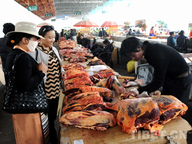 這是在那曲鎮(zhèn)綜合市場,許多牧民群眾乘坐客運(yùn)班車來這里銷售剛宰殺的牛羊肉(唐召明2012年8月6日攝)