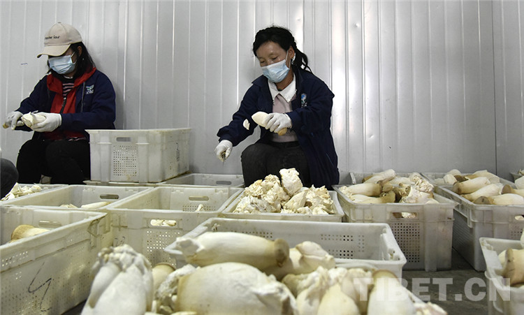 圖為日喀則市珠峰一見則喜生物科技示范園區(qū)包裝車間里工人正在包裝杏鮑菇 攝影:王媛媛