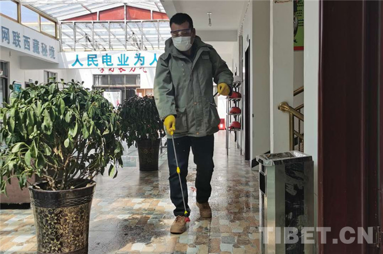 圖為嚴(yán)鋒為項(xiàng)目部各辦公住宿場(chǎng)所進(jìn)行消毒