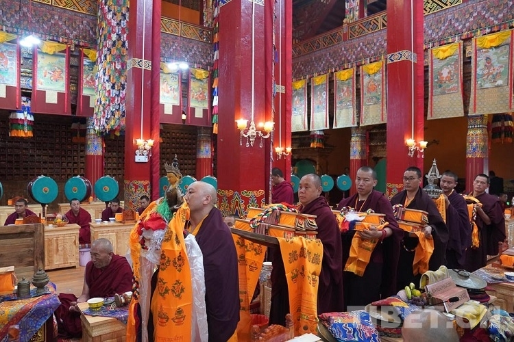 8月30日,在云霧縹緲、稻谷飄香中,十一世班禪經(jīng)曲折蜿蜒的盤(pán)山路前往仁青崩寺禮佛。在寺廟僧人的迎接下,十一世班禪前往杜康殿,隨后十一世班禪登上杜康殿寶座,僧眾集體誦經(jīng)祈福,心誠(chéng)意敬、虔誠(chéng)跪拜,寺院僧人向十一世班禪敬獻(xiàn)曼扎。十一世班禪為僧眾摸頂賜福、賜贈(zèng)金剛結(jié)及法相照片、發(fā)放布施。