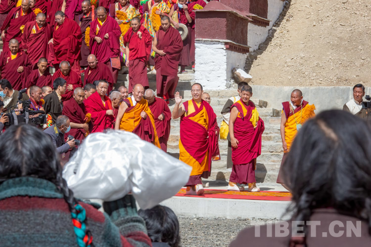 聽聞十一世班禪到來,附近村莊的信教群眾早早地等候在展佛臺前,開光儀式結(jié)束后,十一世班禪停下腳步為他們祈福。