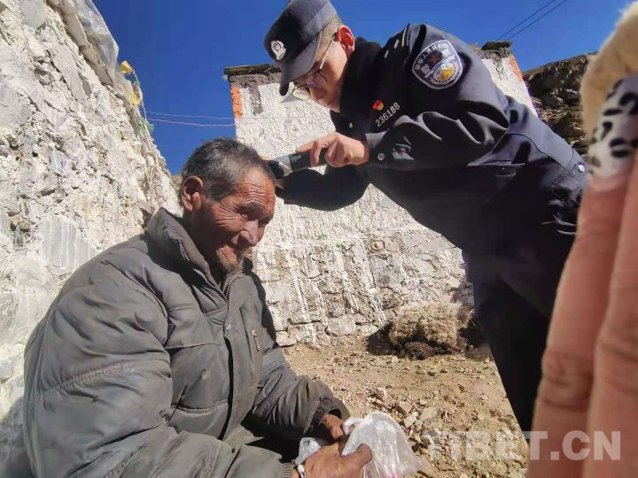 圖為達(dá)瓦次仁為為彭措林那嘎村孤寡老人剪頭發(fā)