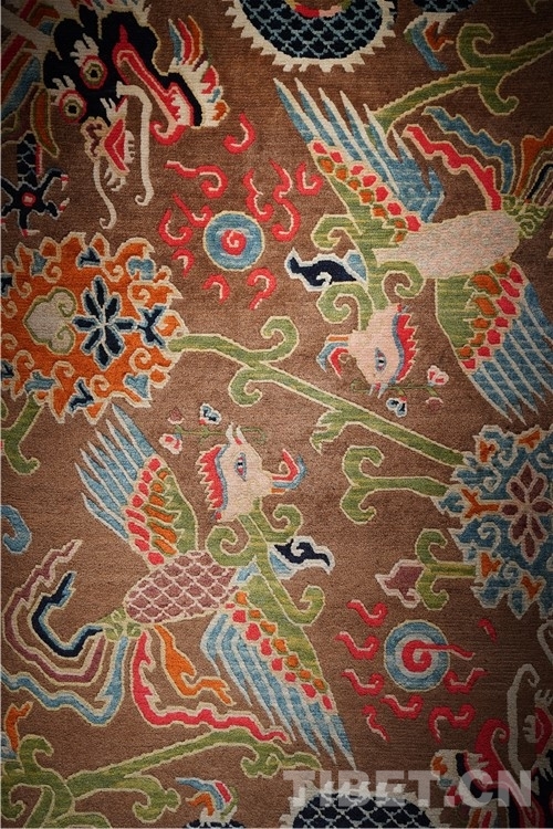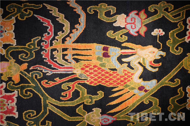 藏毯的圖案、色彩所包含的人文精神,濃縮著藏漢民族交往交流交融的歷史。藏毯在明朝時期就以選毛純、做工細(xì)、顏色美和花樣全著稱,尤其是西藏發(fā)明的“拉桿結(jié)扣法”確定了藏毯栽絨長和絨頭粗的特點,成就了藏毯的精致與典雅。