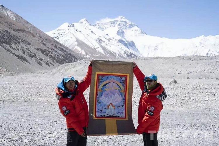 圖為2020年5月中國珠峰高程測量登山隊(duì)手持《珠峰疊彩》新唐卡在珠峰腳下合影