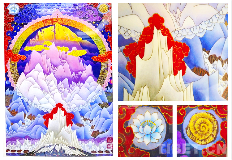 而令葉星生深受觸動的,是十世班禪大師對創(chuàng)作的關(guān)心、前衛(wèi)的創(chuàng)作思路和嚴(yán)格的要求?!笆腊喽U大師多次提出指導(dǎo)意見,鼓勵我們大膽創(chuàng)新,要融入光影等繪畫新技法及漢族傳統(tǒng)繪畫技法,使珠峰更有立體感,使畫作成為現(xiàn)代藝術(shù)技法與藏族傳統(tǒng)繪畫手法相融合的代表,成為民族團(tuán)結(jié)的象征。所以,這幅畫在結(jié)構(gòu)上參考了唐卡,比如彩虹;祥云、太陽、月亮、星斗對稱的方式等來自西藏傳統(tǒng)壁畫藝術(shù);但在光線、明暗對比等方面加入了漢地工筆重彩,甚至西方的藝術(shù)手法。在天地之間以更加立體的視角展現(xiàn)出了珠峰壯麗雄偉的全景?!?/p>