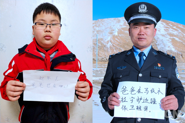 這是一張拼版照片,孩子名叫閆宸溢,今年10歲,已經(jīng)7年沒(méi)和爸爸一起過(guò)年了,今年和媽媽一起在老家資陽(yáng)過(guò)年。爸爸閆睿是西藏出入境邊防檢查總站阿里邊境管理支隊(duì)馬攸橋邊境檢查站民警。春節(jié)即將到來(lái),他和戰(zhàn)友頂著零下20多度的嚴(yán)寒,守衛(wèi)在海拔4960米的馬攸木拉山下,對(duì)邊境通行的每個(gè)人每輛車進(jìn)行仔細(xì)檢查,守護(hù)著阿里邊境管理區(qū)的東大門。