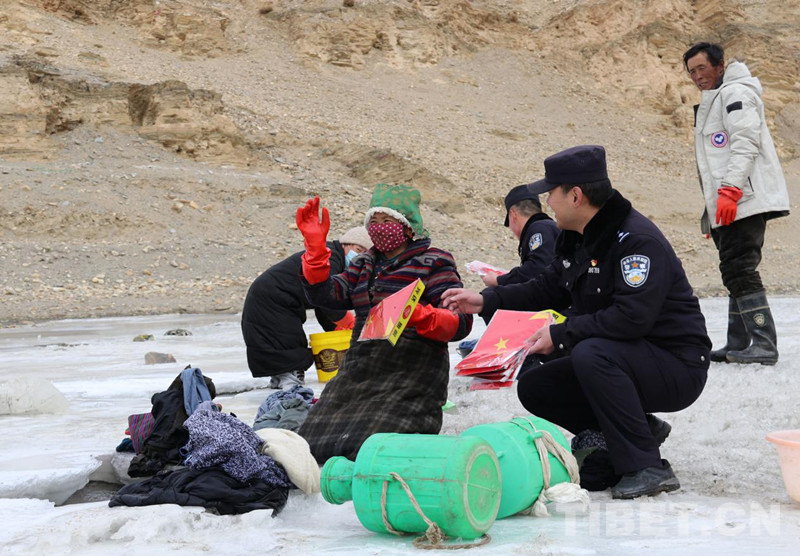 在群眾家里、街道上、冰河上,直克鄉(xiāng)邊境派出所民警向群眾送出了一面面嶄新的國(guó)旗,鮮紅的國(guó)旗映紅了每個(gè)人的臉龐,將揚(yáng)帆啟航新征程的祈愿深入每個(gè)人的心中。直克鄉(xiāng)索白村退伍老兵朗加激動(dòng)地說(shuō):“國(guó)旗是祖國(guó)的象征和標(biāo)志,需要共同守護(hù)。在雪域高原上,你們戰(zhàn)嚴(yán)寒、耐寂寞,披星戴月、頂風(fēng)踏雪,燃起了警民‘共話護(hù)邊’的愛國(guó)熱情,謝謝你們用實(shí)際行動(dòng)溫暖著我們?!?/p>
