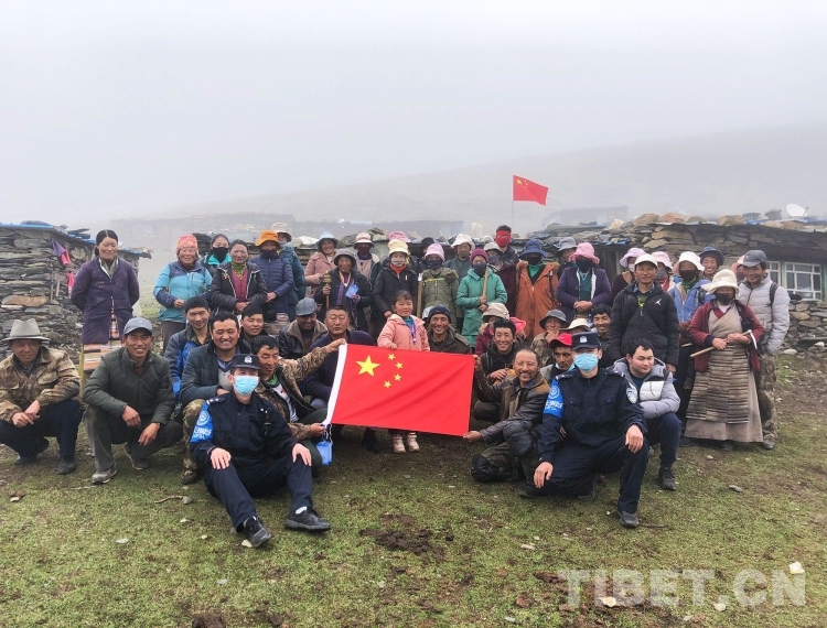 圖為三安曲林邊境派出所民警和群眾與國旗合影