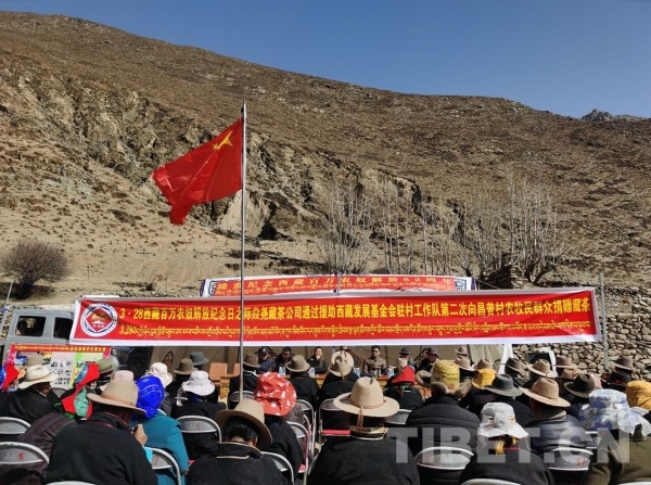 援助西藏發(fā)展基金會駐多角鄉(xiāng)昌普村工作隊與雅安相關(guān)藏茶公司向昌木普村每位村民獻上哈達并捐贈60份優(yōu)質(zhì)藏茶,表達對全體村民深情祝福。