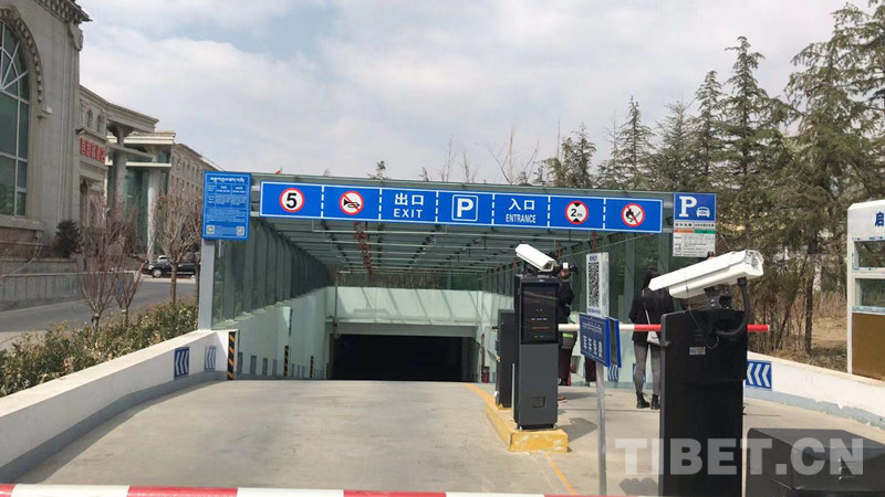 圖為拉薩市區(qū)一座停車場入口,左側張貼著農牧民限時免費停車標識牌
