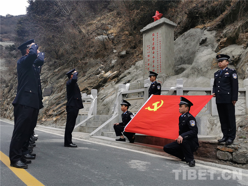 在山南市,西藏山南邊境管理支隊(duì)各級(jí)組織在祖國(guó)雪域邊關(guān)開(kāi)展祭掃活動(dòng)。斗玉邊境派出所移民管理警察來(lái)到位于駐地邊境一線的“將軍崖”,將佇立于此的烈士紀(jì)念碑擦拭干凈,并將鮮花放置碑前,深情緬懷37年前在此巡邊時(shí)因突發(fā)重疾而獻(xiàn)出寶貴生命的原西藏軍區(qū)司令員張貴榮將軍。在紀(jì)念碑前,在黨旗之下,在群山環(huán)抱之中,移民管理警察高舉緊握的右拳,再次重溫入黨誓詞,將革命先烈的戍邊遺志與奉獻(xiàn)精神深銘心間。