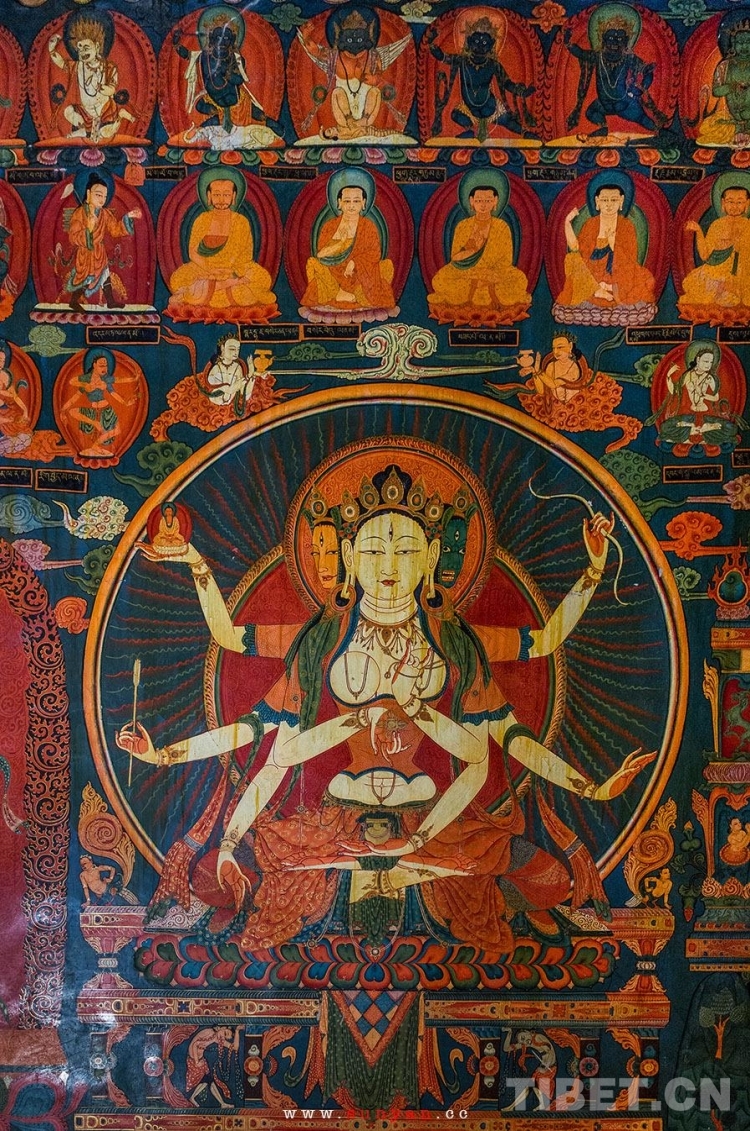 古格王朝遺址遺存數(shù)量最多、最為完整的是它的壁畫,古格壁畫氣勢(shì)宏大、風(fēng)格獨(dú)特,由于所處地理位置及受多種外來(lái)文化的影響,古格壁畫帶有明顯的克什米爾特點(diǎn)。