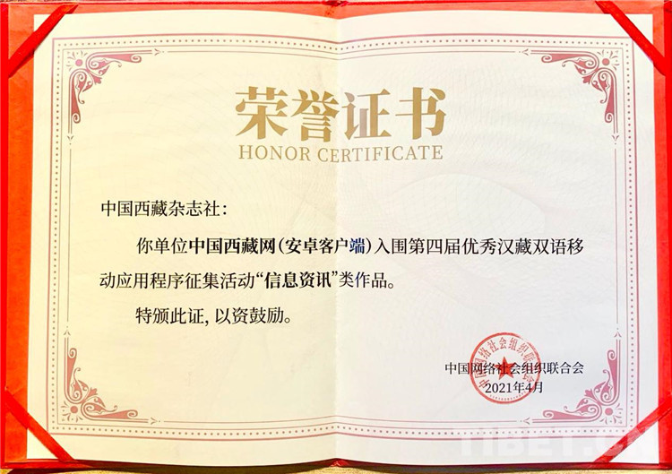 圖為中國西藏網(wǎng)的獲獎(jiǎng)榮譽(yù)證書
