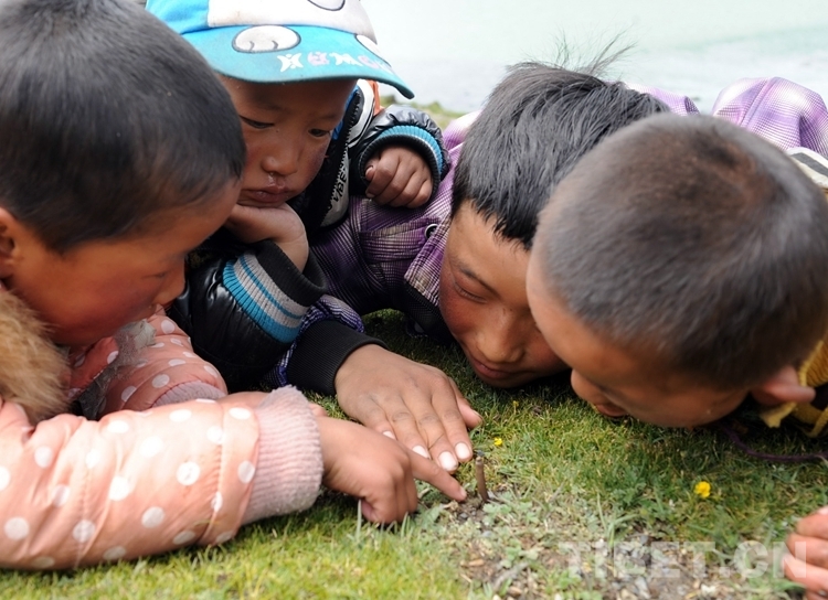 圖為藏北薩普冰川下的草地上,幾名兒童在觀察一根發(fā)現(xiàn)的蟲(chóng)草(唐召明2014年7月10日攝)