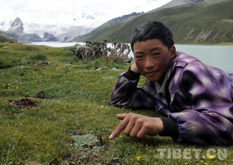 圖為一名牧家大男孩手指藏北比如縣薩普冰川下的草地上生長(zhǎng)的一根蟲(chóng)草(唐召明2014年7月10日攝)