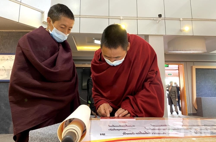 圖為2021年5月,“同心共筑中國(guó)夢(mèng)”——西藏僧尼群眾書法精品展現(xiàn)場(chǎng),僧尼正在觀看展現(xiàn)了烏金體、朱匝體等20余種風(fēng)格迥異的藏文書法體系的書法作品《藏文字體大全》 攝影:王媛媛