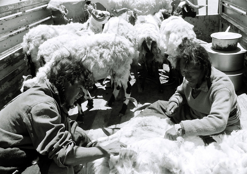 這是尼瑪縣牧民在所包租的卡車車廂里用刀在“割”羊毛(唐召明1987年攝)