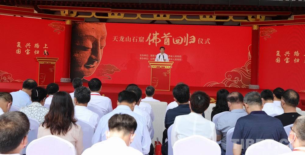 7月24日,天龍山石窟佛首回歸儀式在山西太原舉行。文化和旅游部副部長、國家文物局局長李群,山西省委書記、省人大常委會主任林武為“復(fù)興路上 國寶歸來”特展揭幕,山西省委副書記、山西省人民政府省長藍(lán)佛安,山西省委常委、太原市委書記羅清宇致辭,山西省委常委、宣傳部部長呂巖松,山西省委常委、秘書長李鳳岐,佛首捐贈人張榮出席儀式,山西省人民政府副省長張復(fù)明主持儀式。